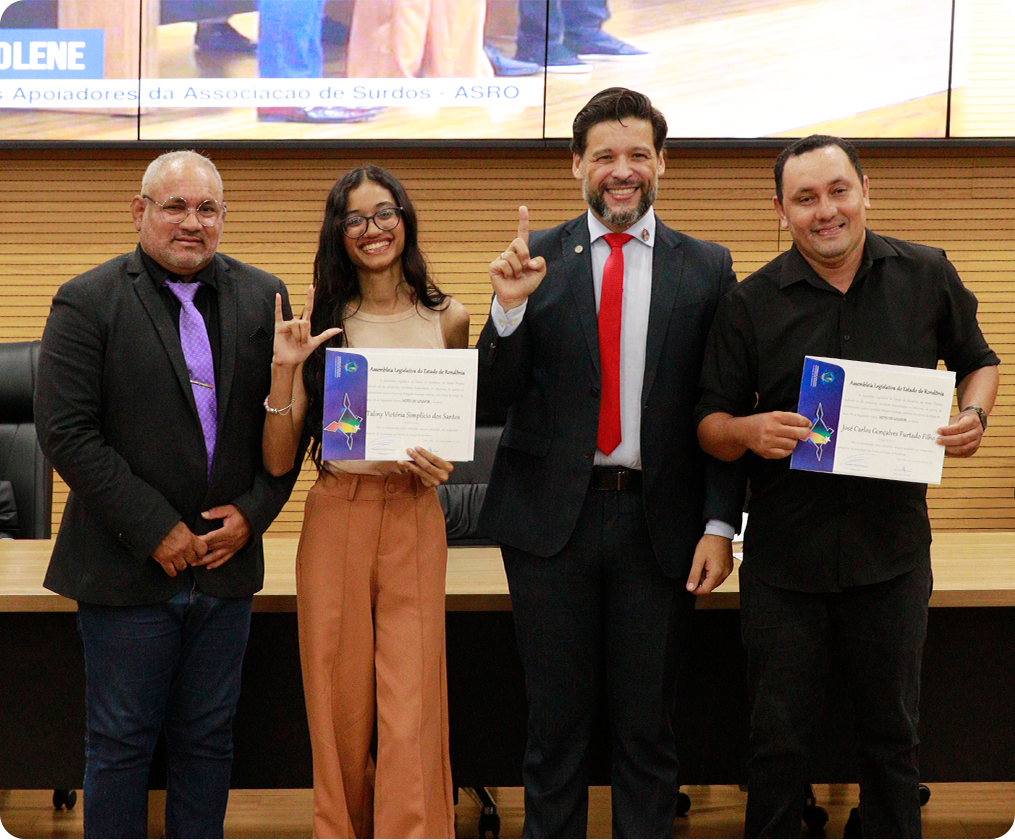A Defensoria Pública do Estado de Rondônia (DPE/RO) participou de Sessão Solene de outorga de votos de louvor aos integrantes e apoiadores da Associação dos Surdos de Rondônia (ASRO), realizada na Assembleia Legislativa do Estado de Rondônia (ALE/RO). A solenidade foi proposta pelo deputado estadual Rodrigo Camargo e reuniu autoridades, representantes de instituições e membros da comunidade surda.
